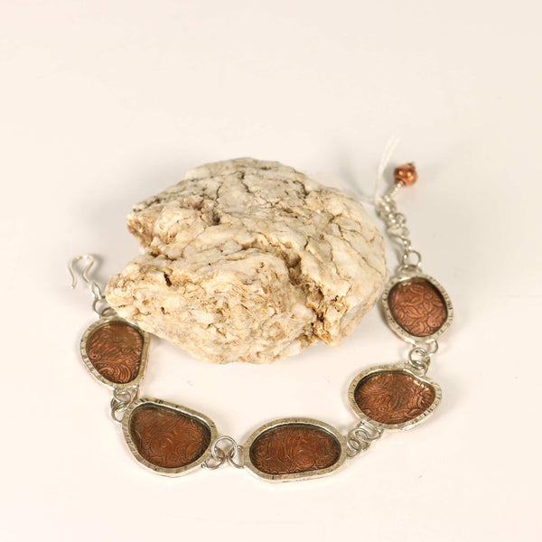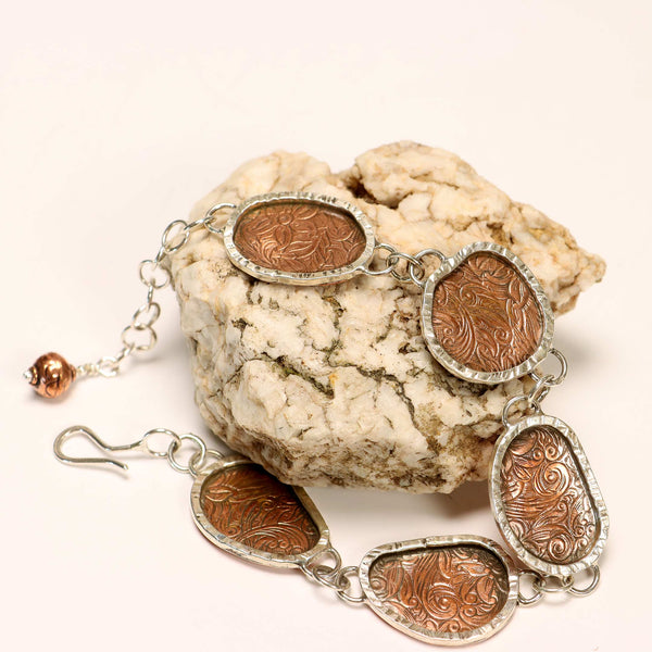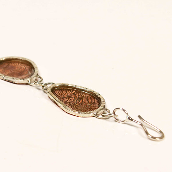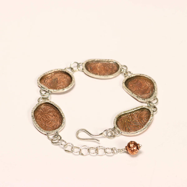 Western style solid copper and sterling link bracelet has five sterling silver framed irregular shaped copper segments embossed in a western floral pattern. Linked with sterling silver chain for an unusual bracelet that is eye catching worn alone or with others. A 2 inch sterling silver extender chain allows you to wear this beautiful piece further up your arm when stacking with others.