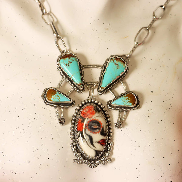 Exquisite Day of the Dead necklace featuring a gorgeous hand painted porcelain Catrina cabochon in black, grey and red encased in sterling silver with sterling silver prickly pair adornment and further enhanced with a crown of tear drop shaped Number 8 turquoise cabochons in blue-green on a chocolate matrix. The sterling silver 'half moon' is decorated with exquisite hand cast sterling silver succulents at each end!