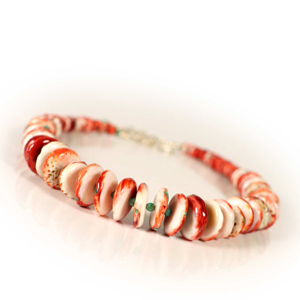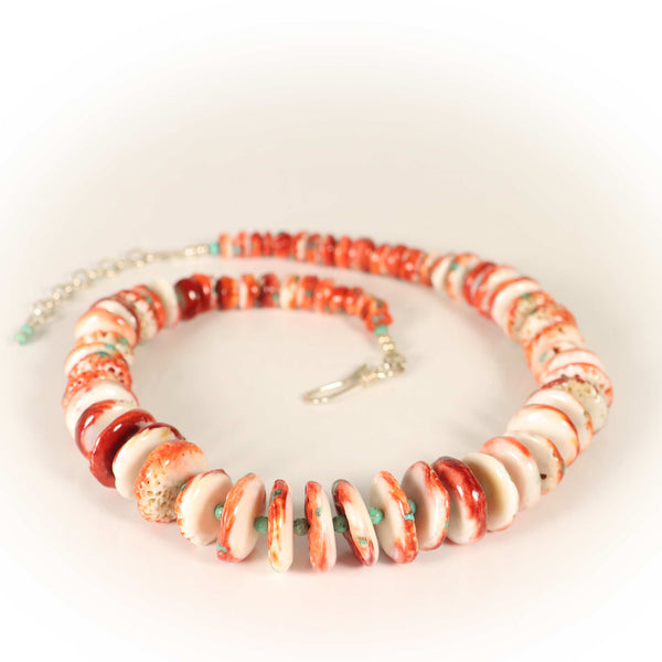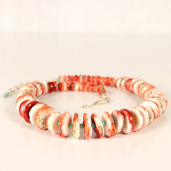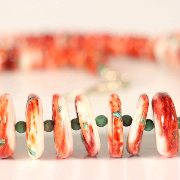 Richly textured spiny oyster beads are enhanced with pops of turquoise and separated by tiny green turquoise beads. Finished with sterling silver beads and a sterling silver hook and chain extender of 2 inches.