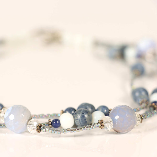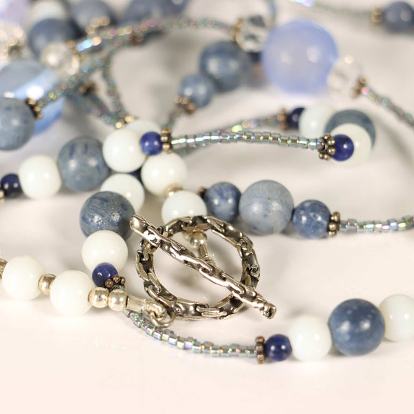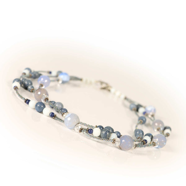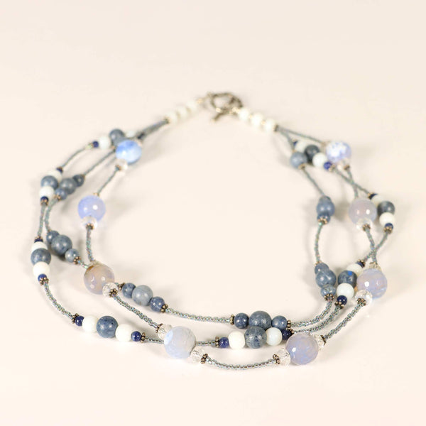 Triple strand of assorted semi-precious beads in hues of blue and white with faceted quartz and shimmering iridescent seed beads as spacers. A sterling silver toggle is the perfect finish.