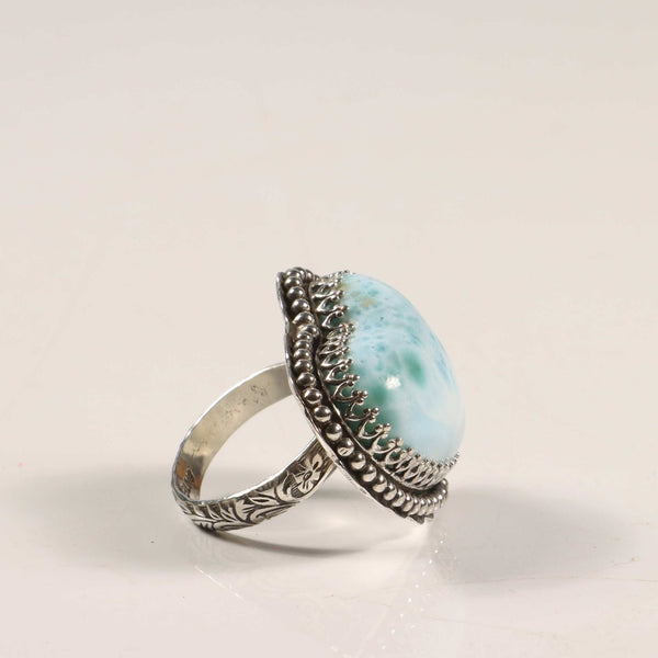 Swirls of light blue with a hint of green in this sweet high-dome Larimar ring. Beaded surround and a floral patterned shank make this beauty elegant and feminine.